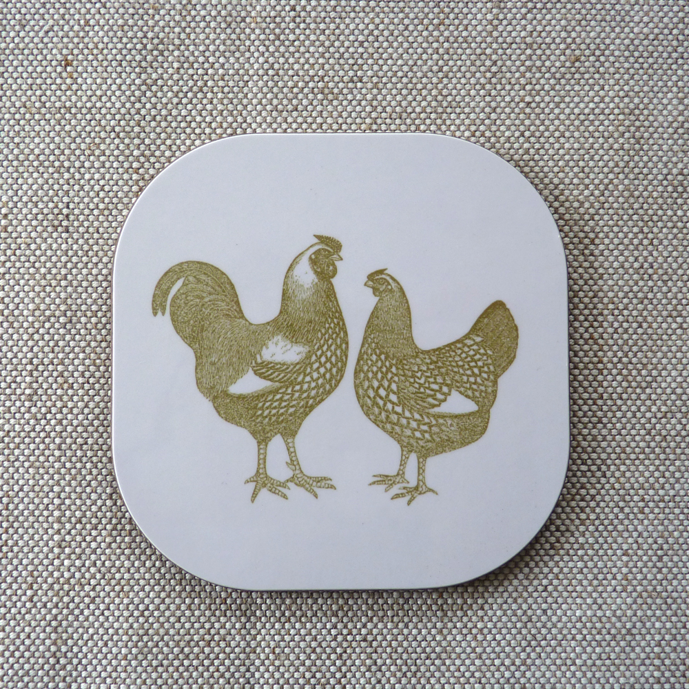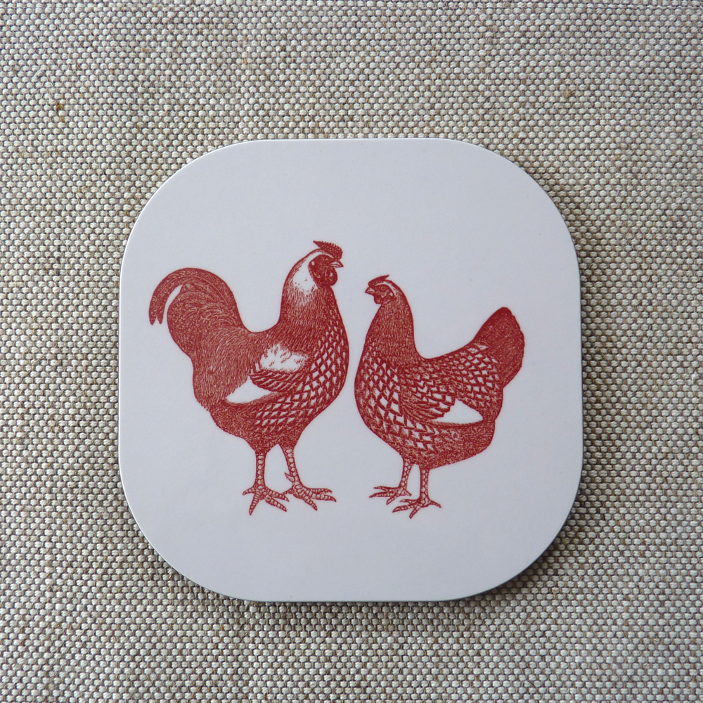 A beautiful set of four chicken coasters (mixed bundle – two red, two green). Designed and printed in England these melamine coasters are gloss finished with a cork backing. They are extremely durable, heat resistant to 165 degrees, stain & scratch resistant too.
